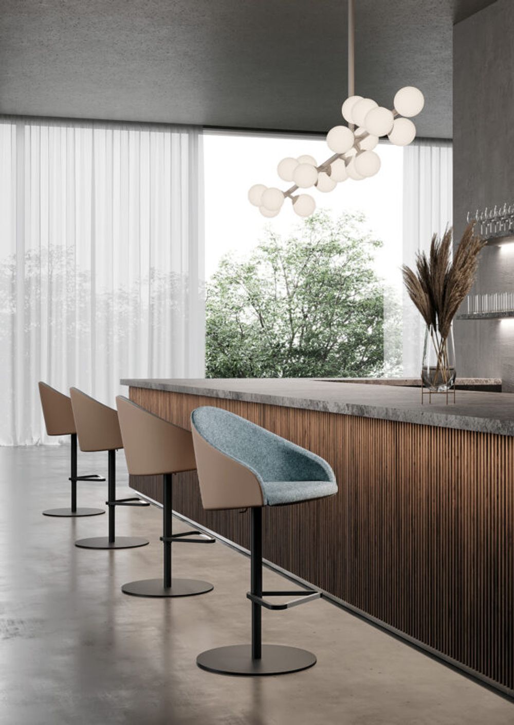 Le tabouret Kameo est disponible avec structure fixe semi-luge ou piètement pivotant avec verin à gaz et repose-pieds.