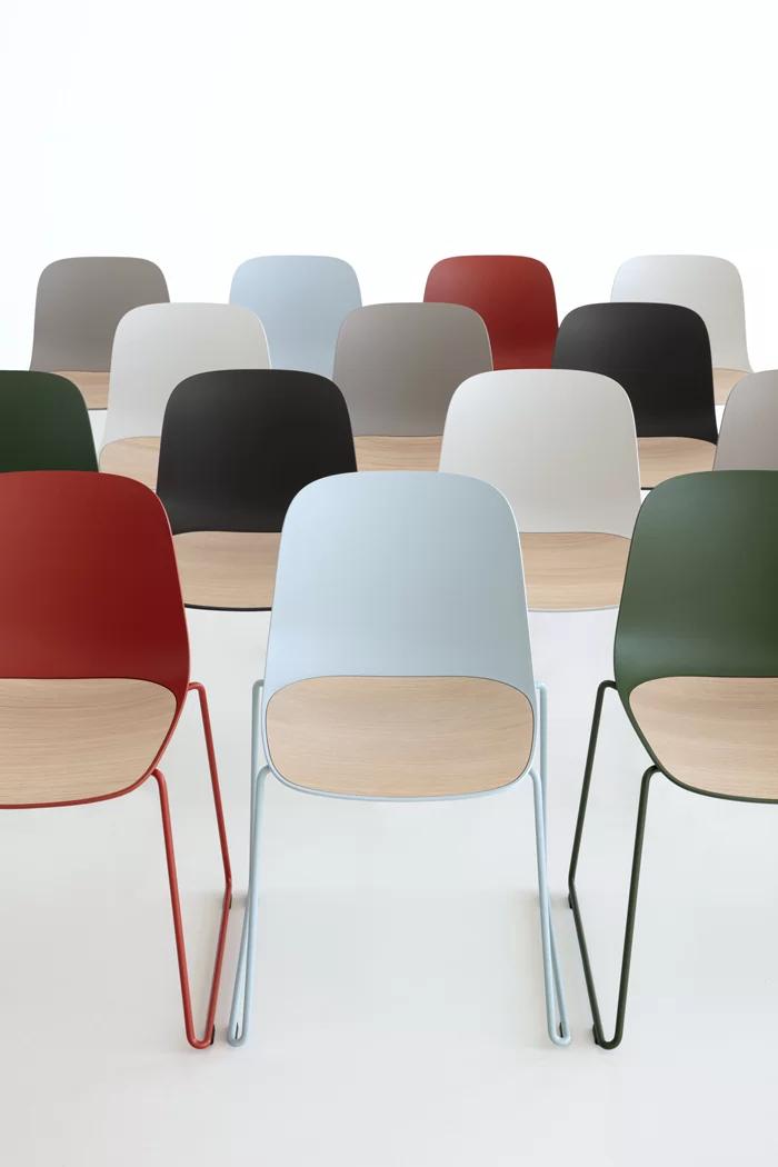 Le système d’assises SEELA présente une coque en polypropylène qui peut être enrichie par la chaleur du bois ou améliorée par le revêtement en tissu.